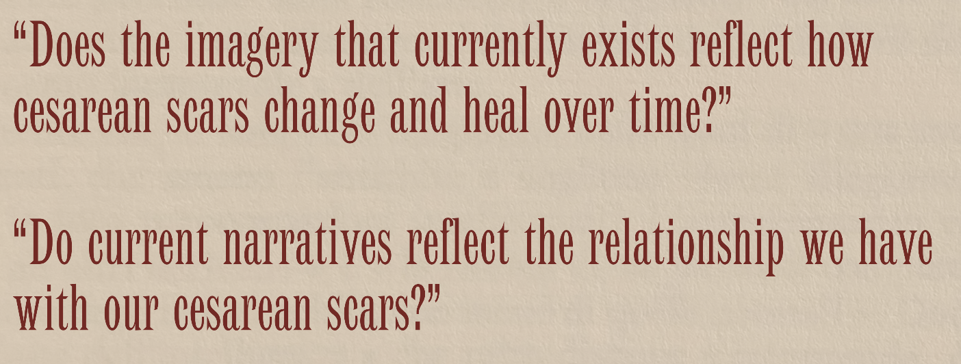 “I FOUND THE ‘NOISE’ ON THE INTERNET ABOUT WHAT THESE SPECIFIC SCARS MEAN- WARRIOR, SURRENDER, BIRTH- TO BE DISSONANT. I FOUND THE DEFAULT SCAR THAT SEARCH ENGINES CHURN OUT- A PALE PINK, SLIGHTLY-TURNED-UP-ON-THE-ENDS SCAR ON A WHITE BODY- TO BE TOO ‘PERFECT’.”